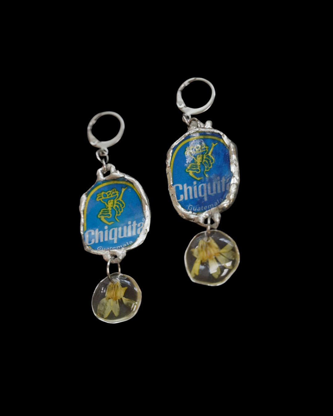 Identity stolen by corp./ Contrasting BANNANNA STICKERS FROM GUATEMALA + Small yellow flowers presserved with resin on STAINLESS steal hooks and LED FREE solder.