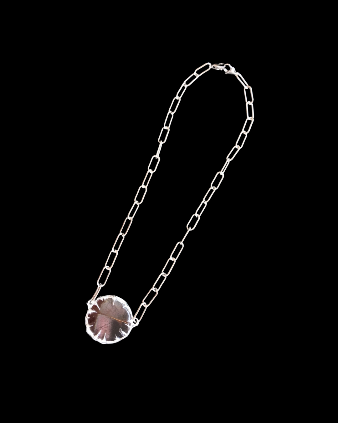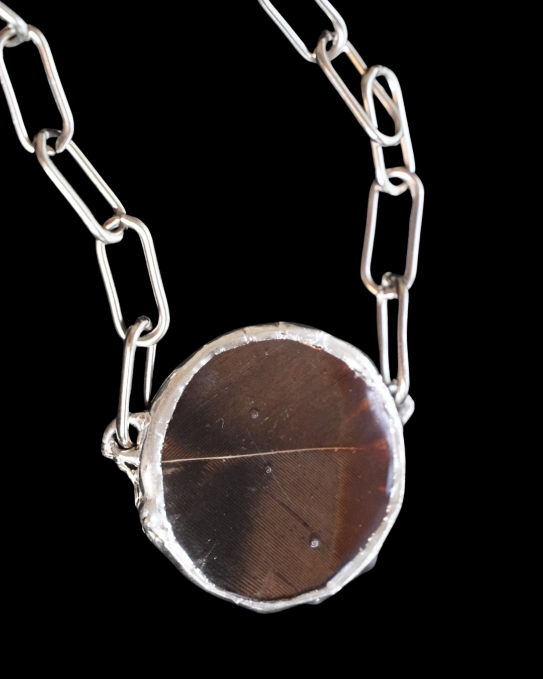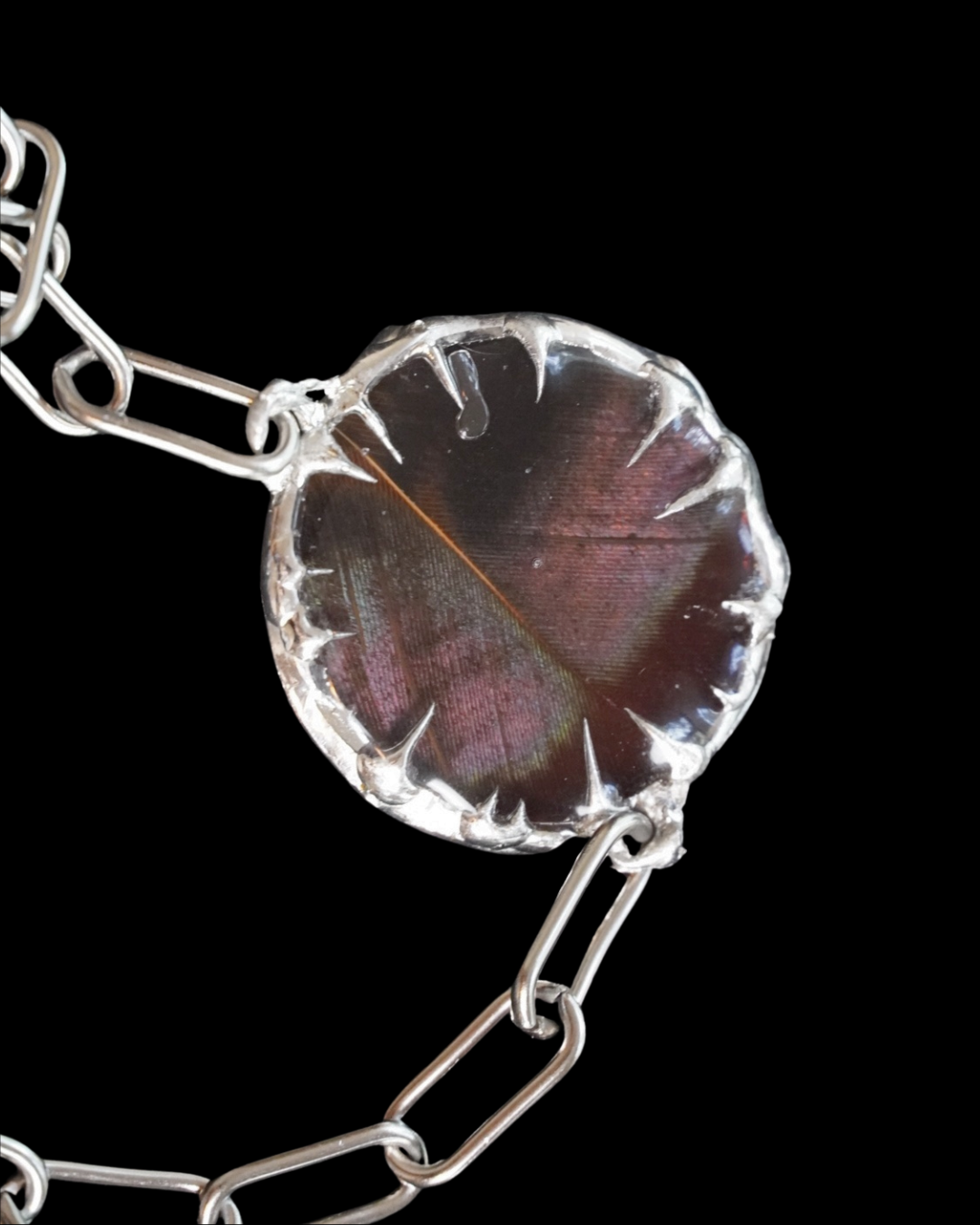 Iridescent Turkey feather preserved in crystal clear resin, set in a round pendant adorned with sharp, ornamental accents.