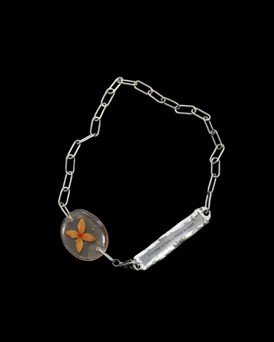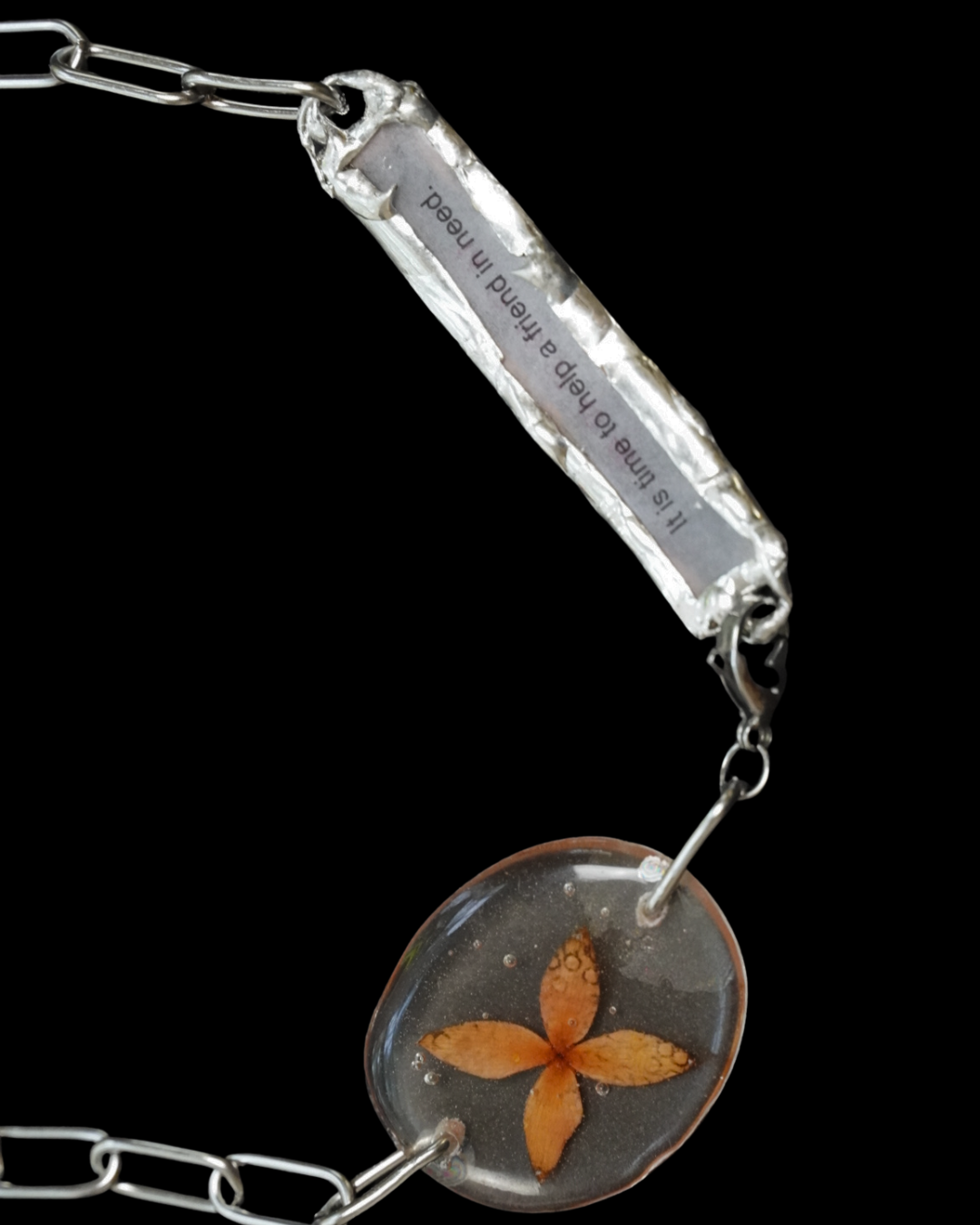 Original necklace featuring a genuine red Ixora flower and a Chinese fortune cookie paper, preserved in crystal clear resin with lead-free solder on a hypoallergenic chain. A fusion of floral vitality and serendipitous fortune.