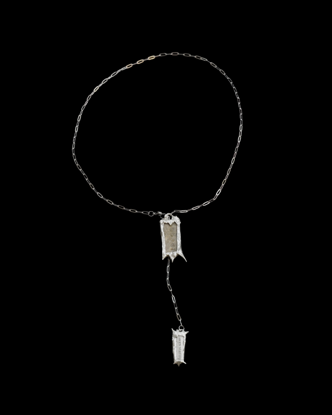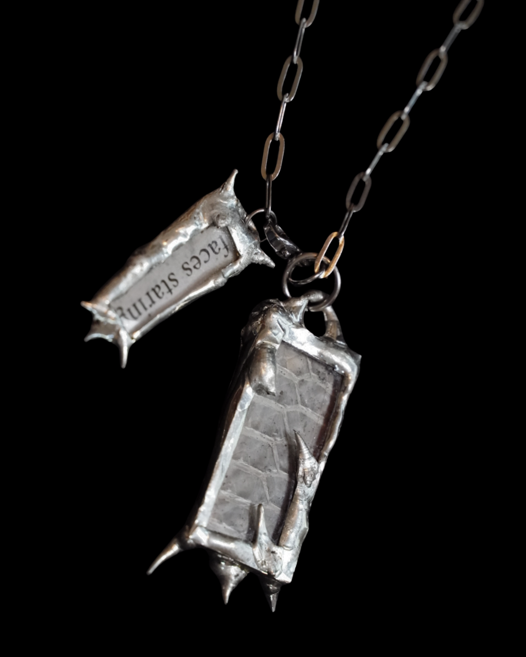 Original tie style necklace fashioned with genuine shed snake skin, paper, glass accents, lead-free solder, and a stainless steel chain.