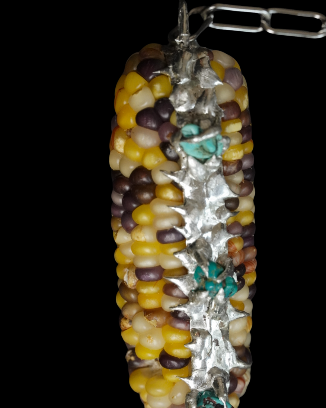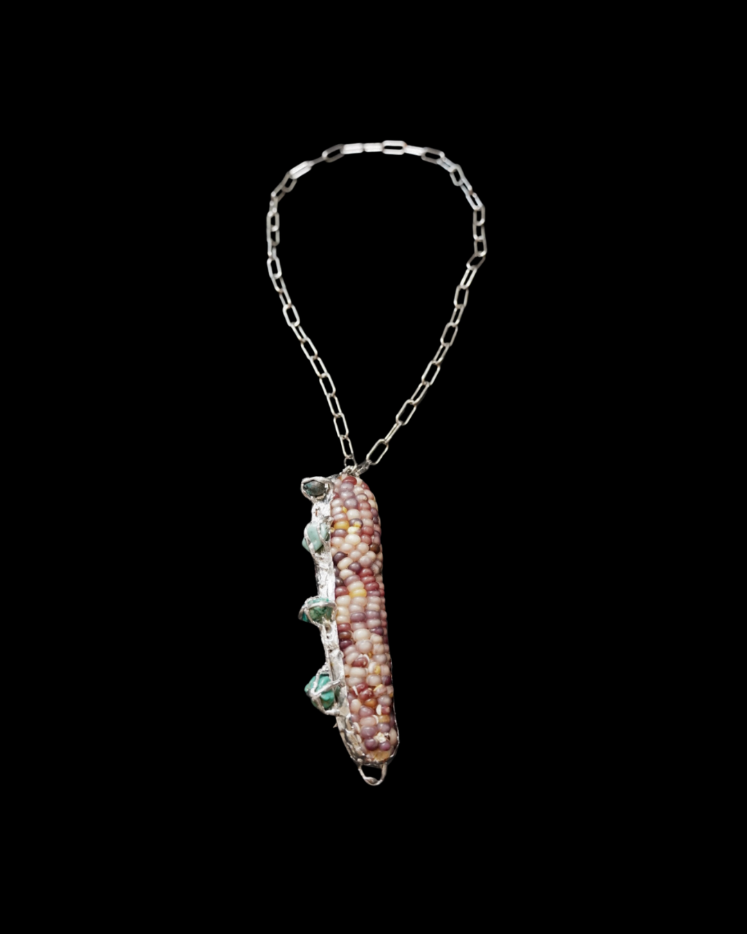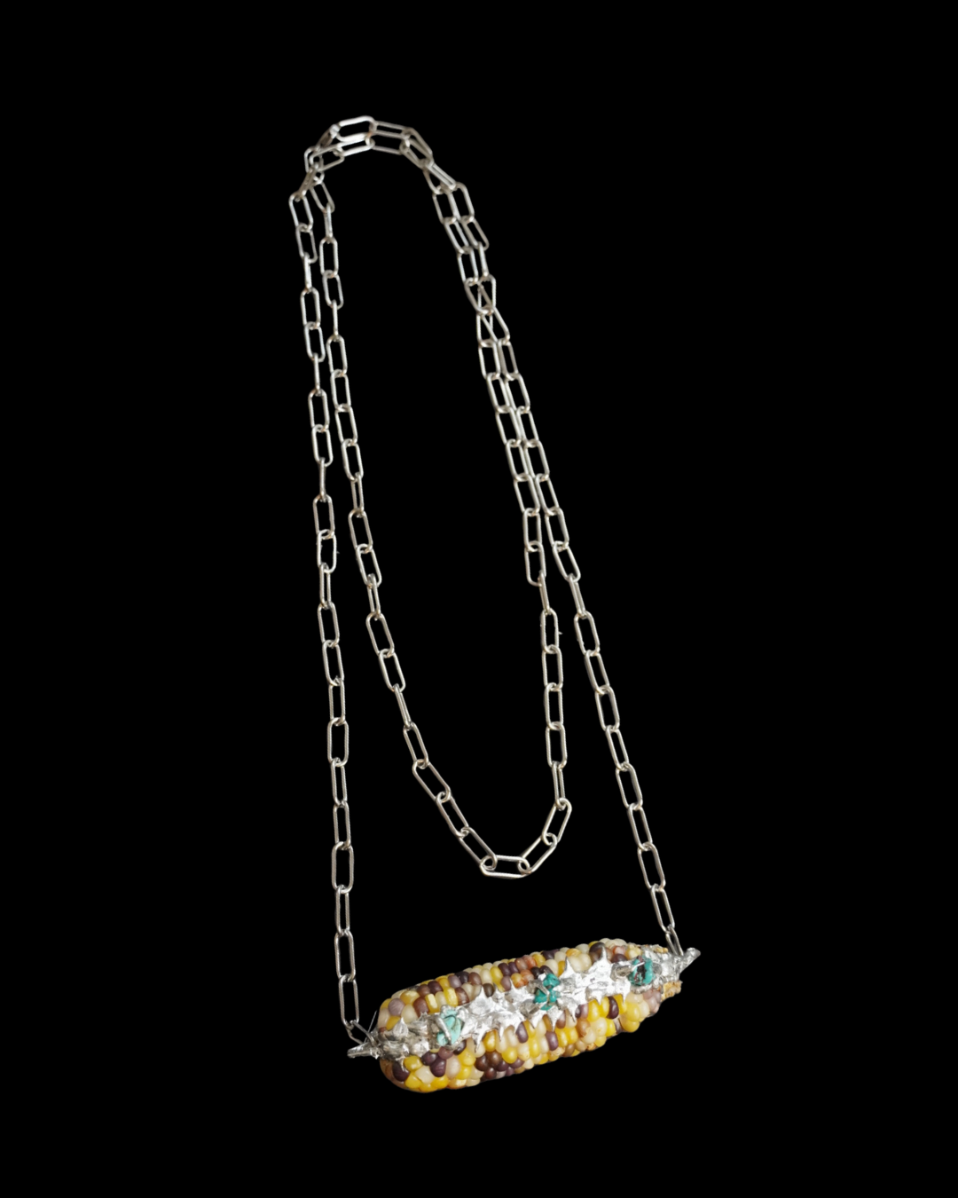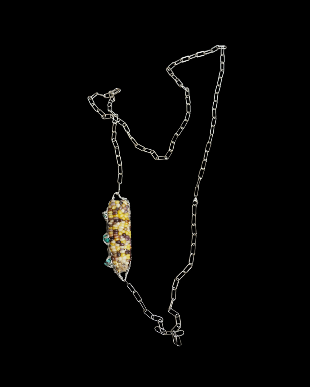 Original body jewelry honoring ancestral sustenance: organic corn grown at Nicoya Farm paired with turquoise stones on long or short stainless steel chains.