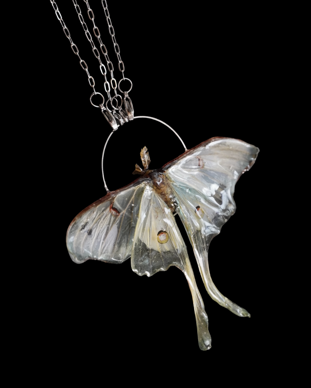 An original, handcrafted piece featuring a genuine luna Moth, ethically sourced from my Dad’s backyard and delicately preserved in resin. Suspended on thin Stainless steal, hypoallergenic, and tarnish-resistant chain, this versatile treasure can be worn as a long or short necklace, draped across the torso, cinched at the waist or as a scarf ring.