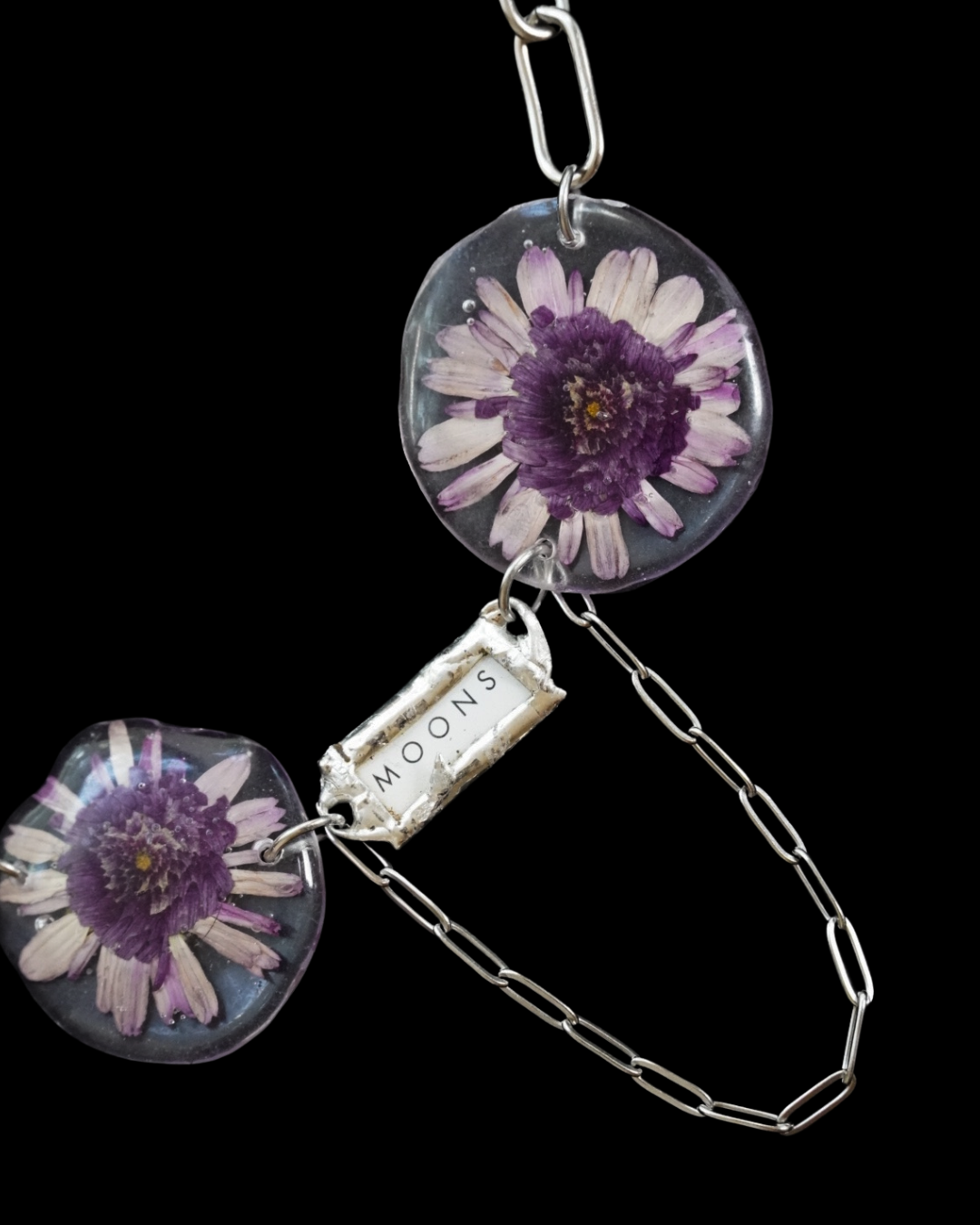 Original necklace featuring purple aster flowers and repurposed paper, preserved in crystal clear resin and finished with lead free solder on a hypoallergenic stainless steel chain.