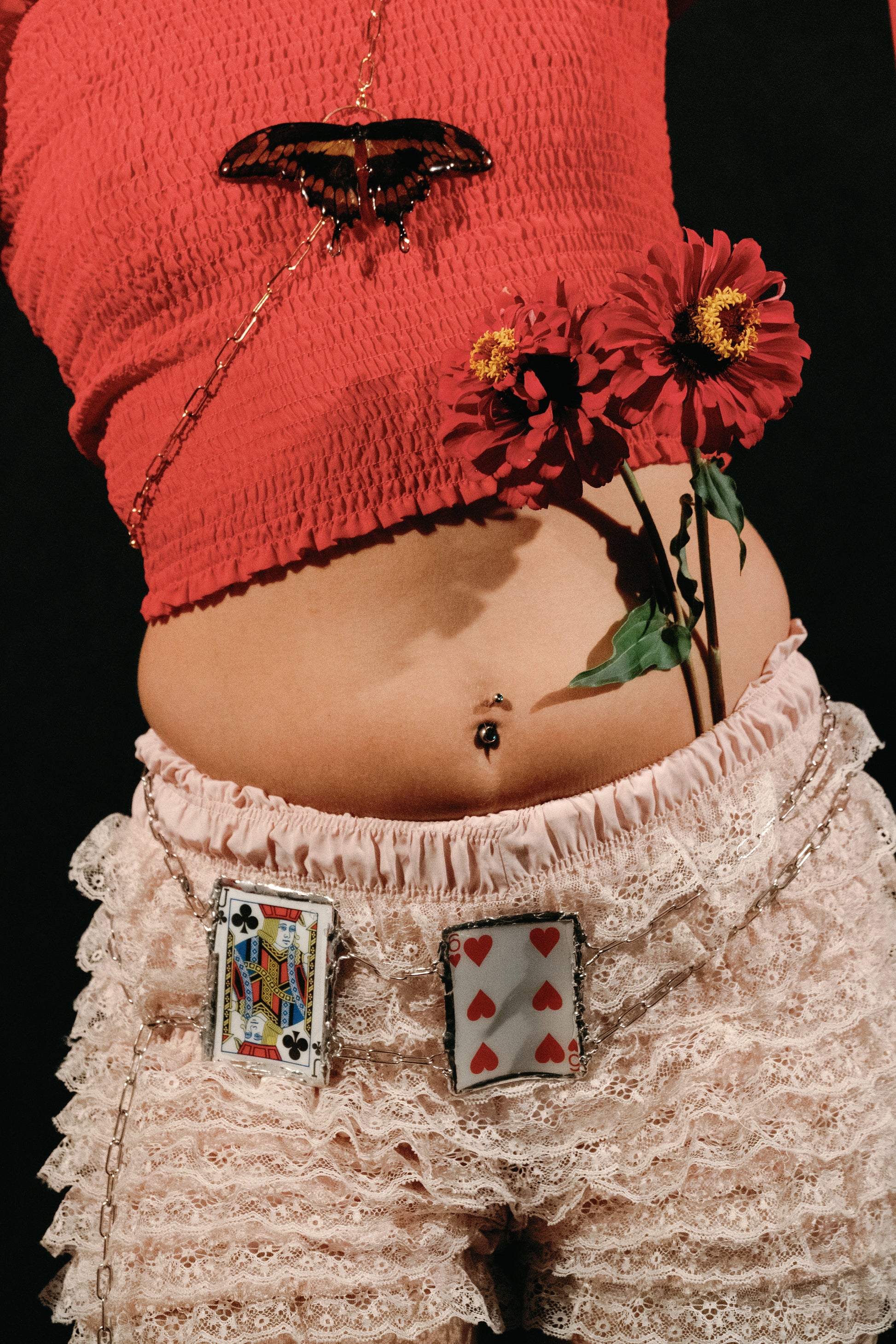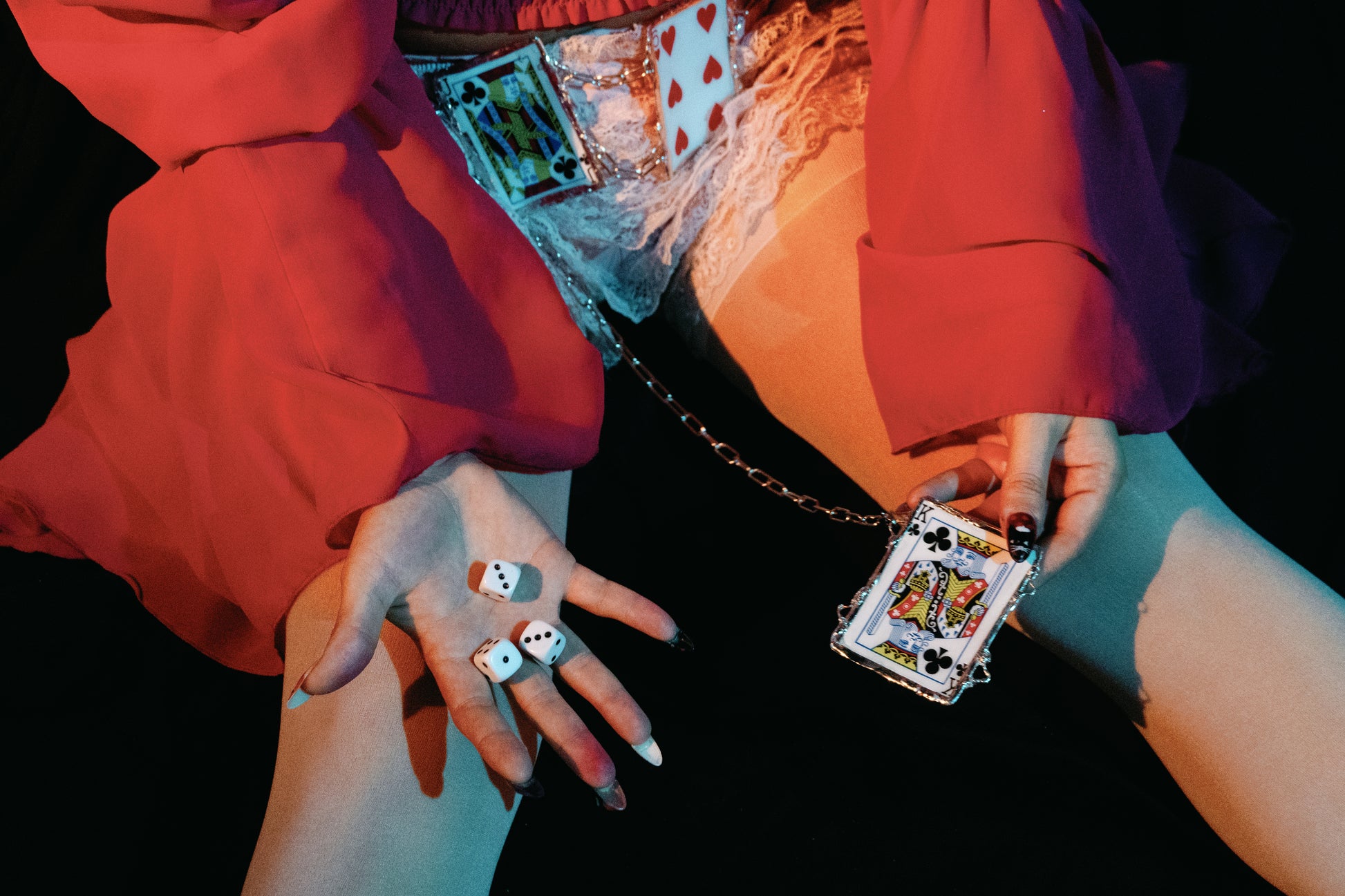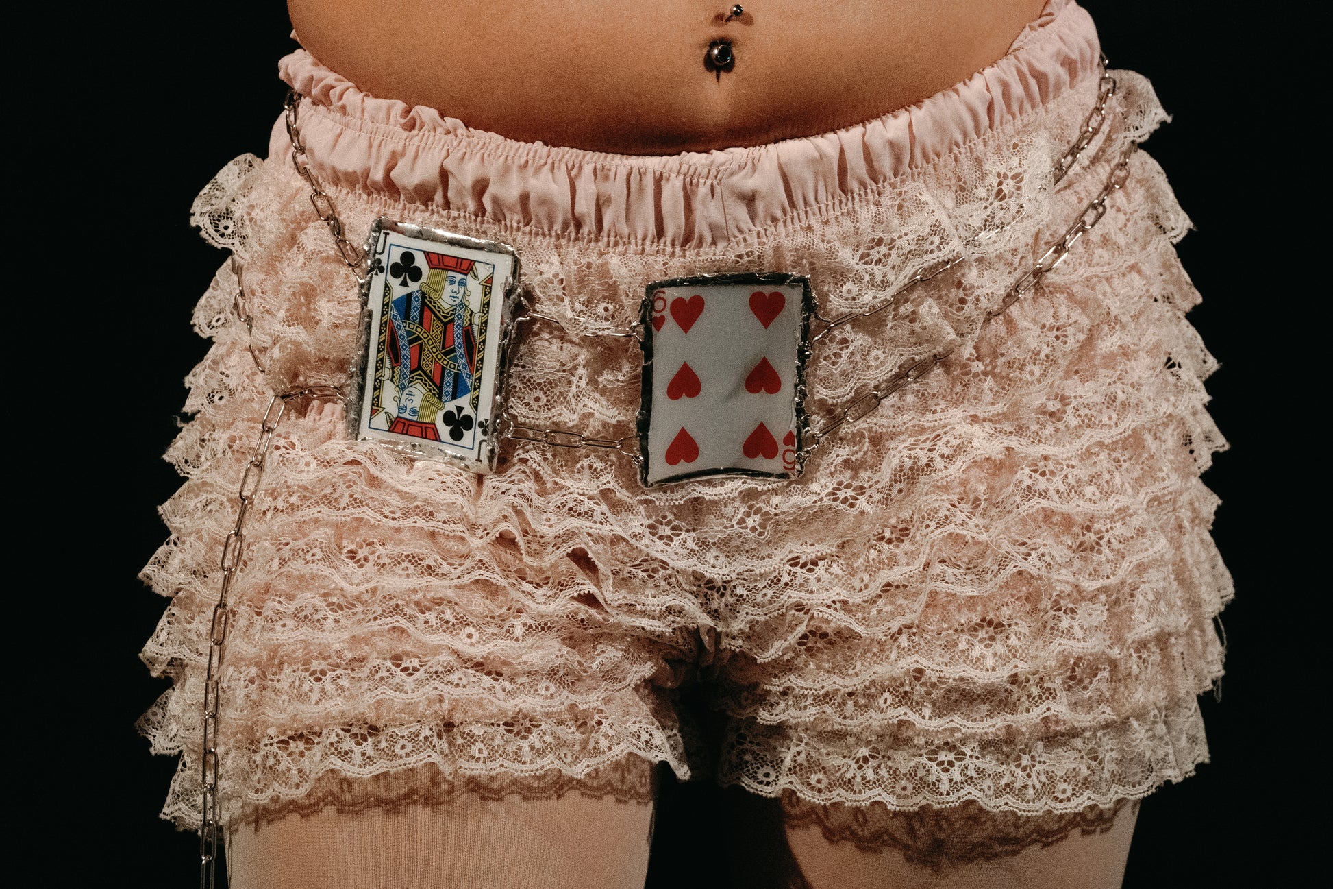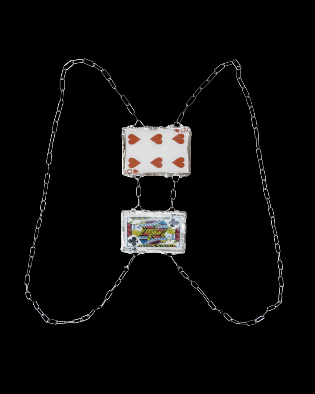 Playful, versatile body jewelry made with repurposed poker cards and stainless steel chain. Wear it across the chest, around the hips, or in any style your imagination allows.
