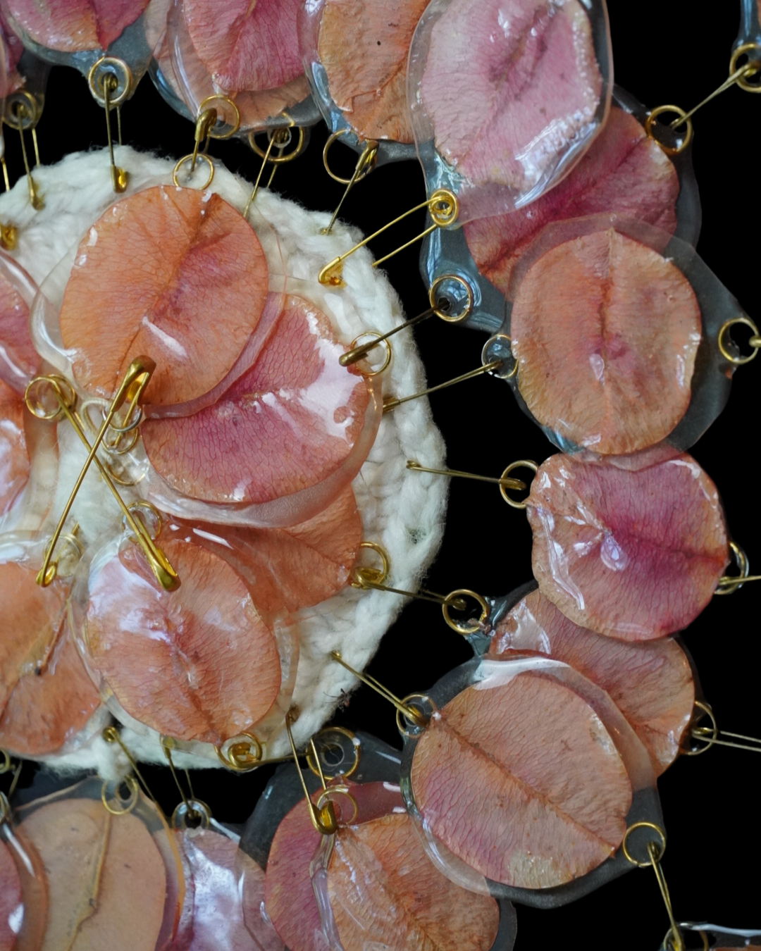 Each translucent petal holds soft hues of blush, cream, and rose, revealing the natural veins and textures of the rain tree flower. The embedded seeds add depth and grounding, honoring the plant’s cycle of flowering, seeding, and renewal. Golden safety pins connect each element, symbolizing both protection and connection, strength held within delicacy.