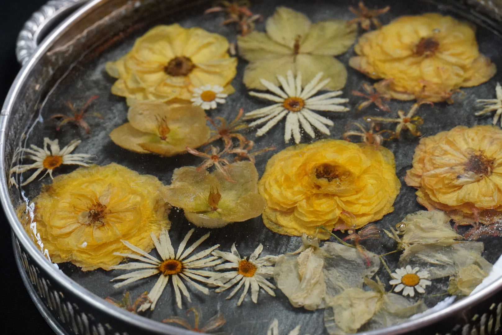 This piece is made by carefully drying and preserving your actual wedding flowers, then casting them in resin to hold their shape, color, and meaning. They're mounted on a repurposed vintage silver tray, giving new life to something old—just like your flowers take on a new form here.