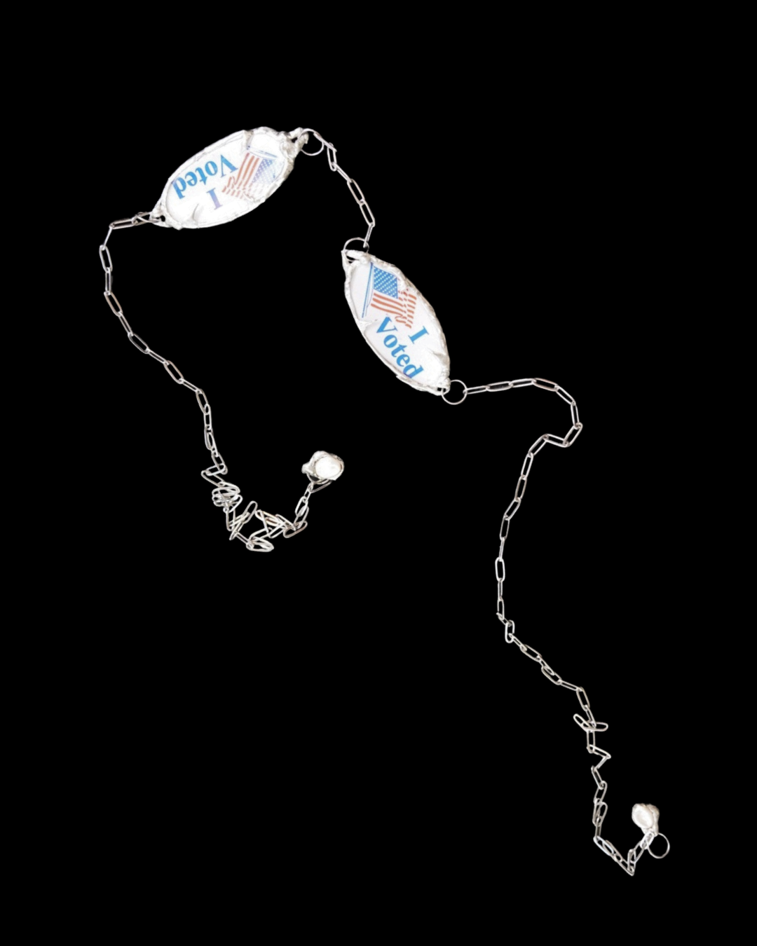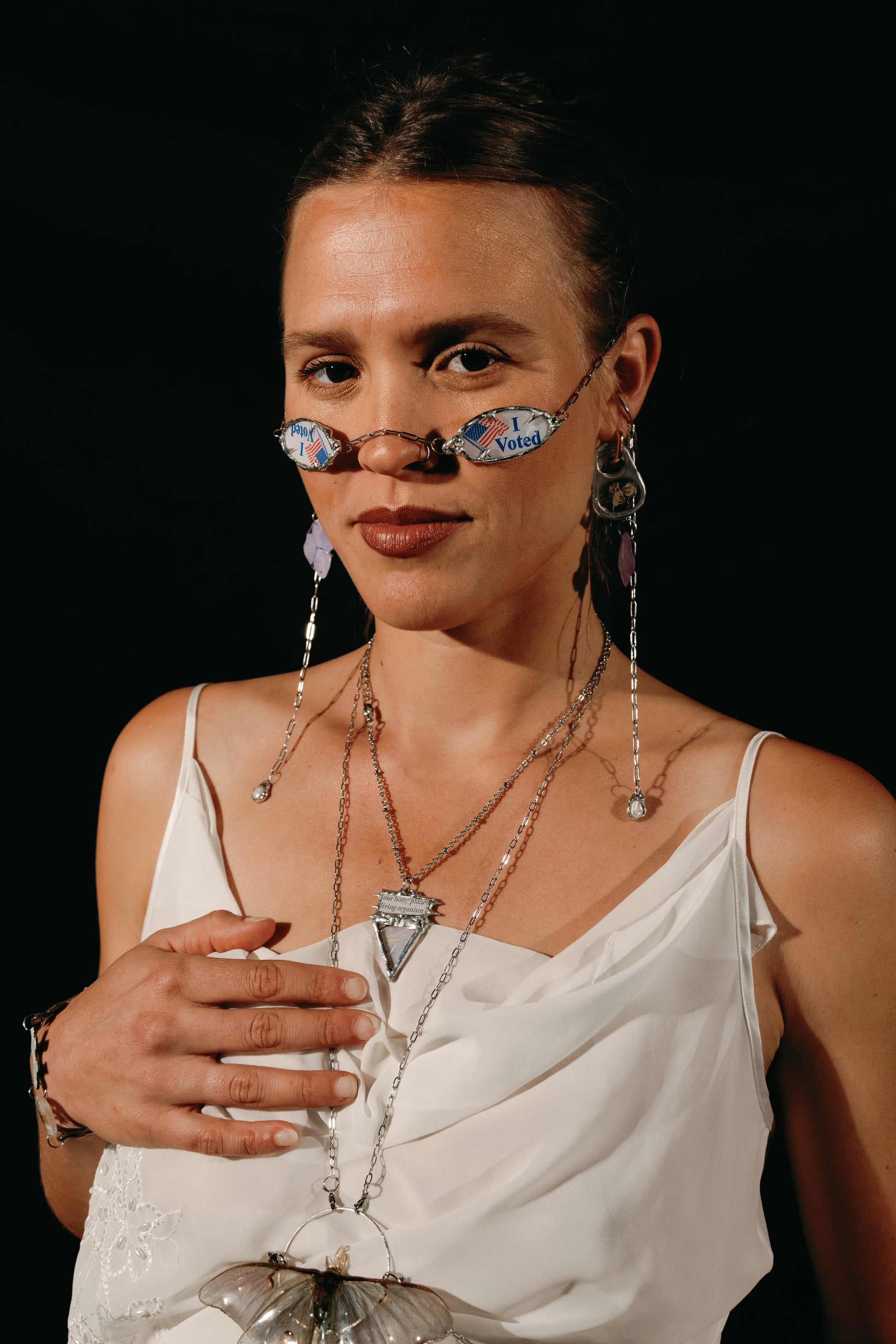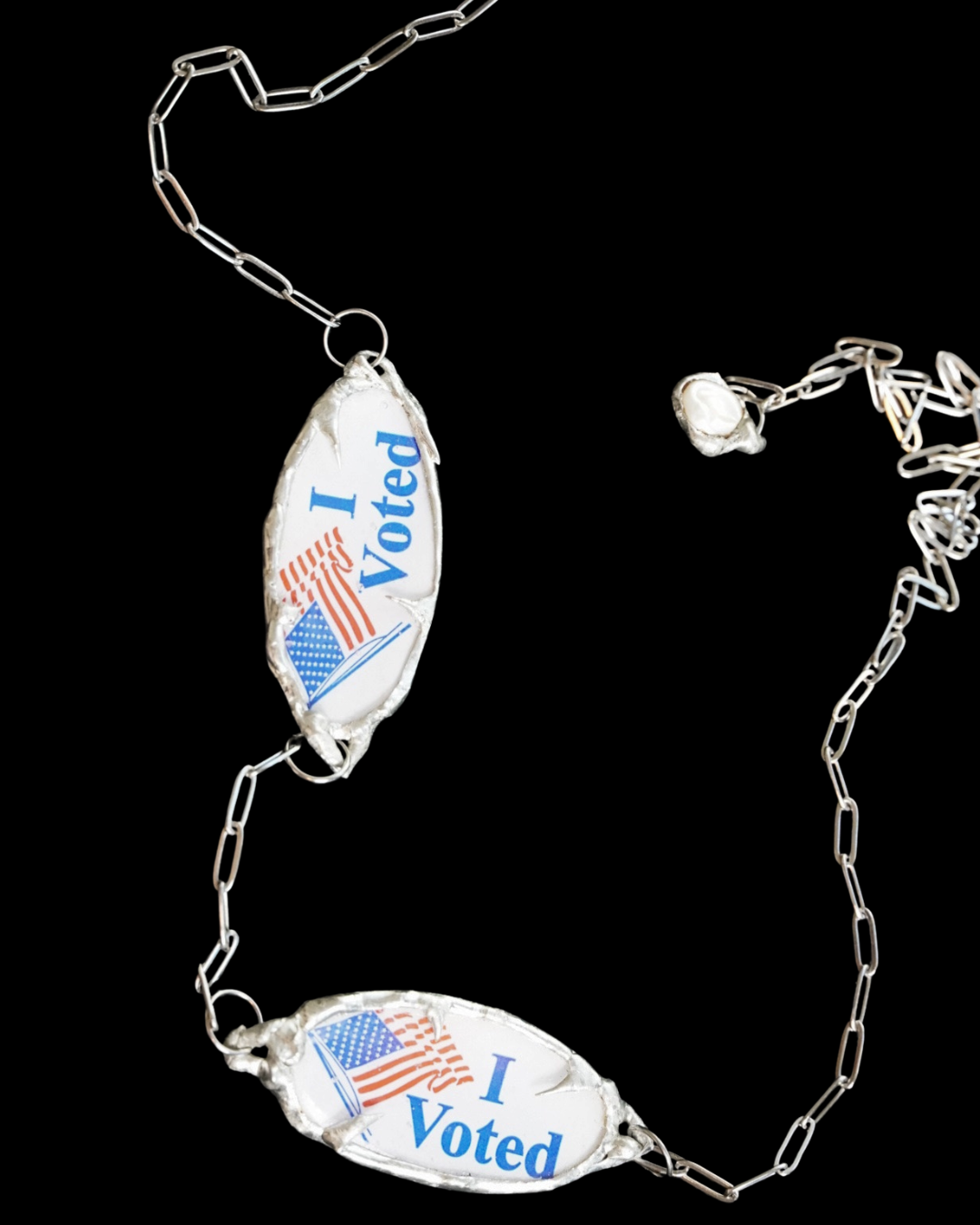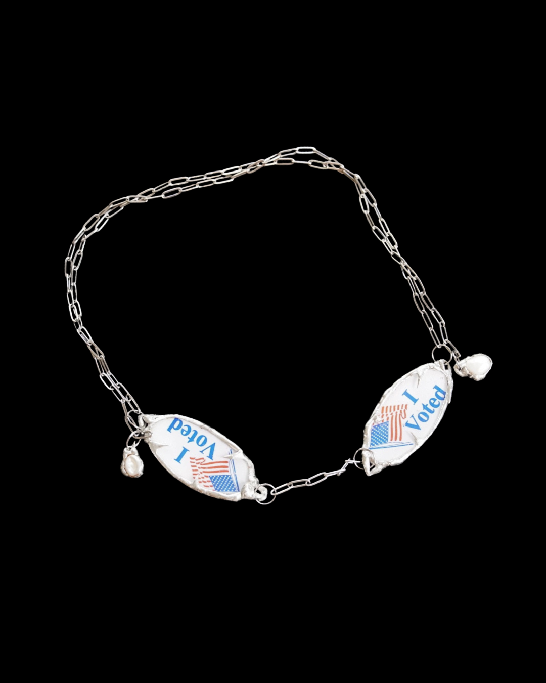 Original face jewelry made with repurposed “I Voted” stickers, pearls, and lead-free solder. A bold, wearable statement for justice and civic participation, merging adornment with advocacy