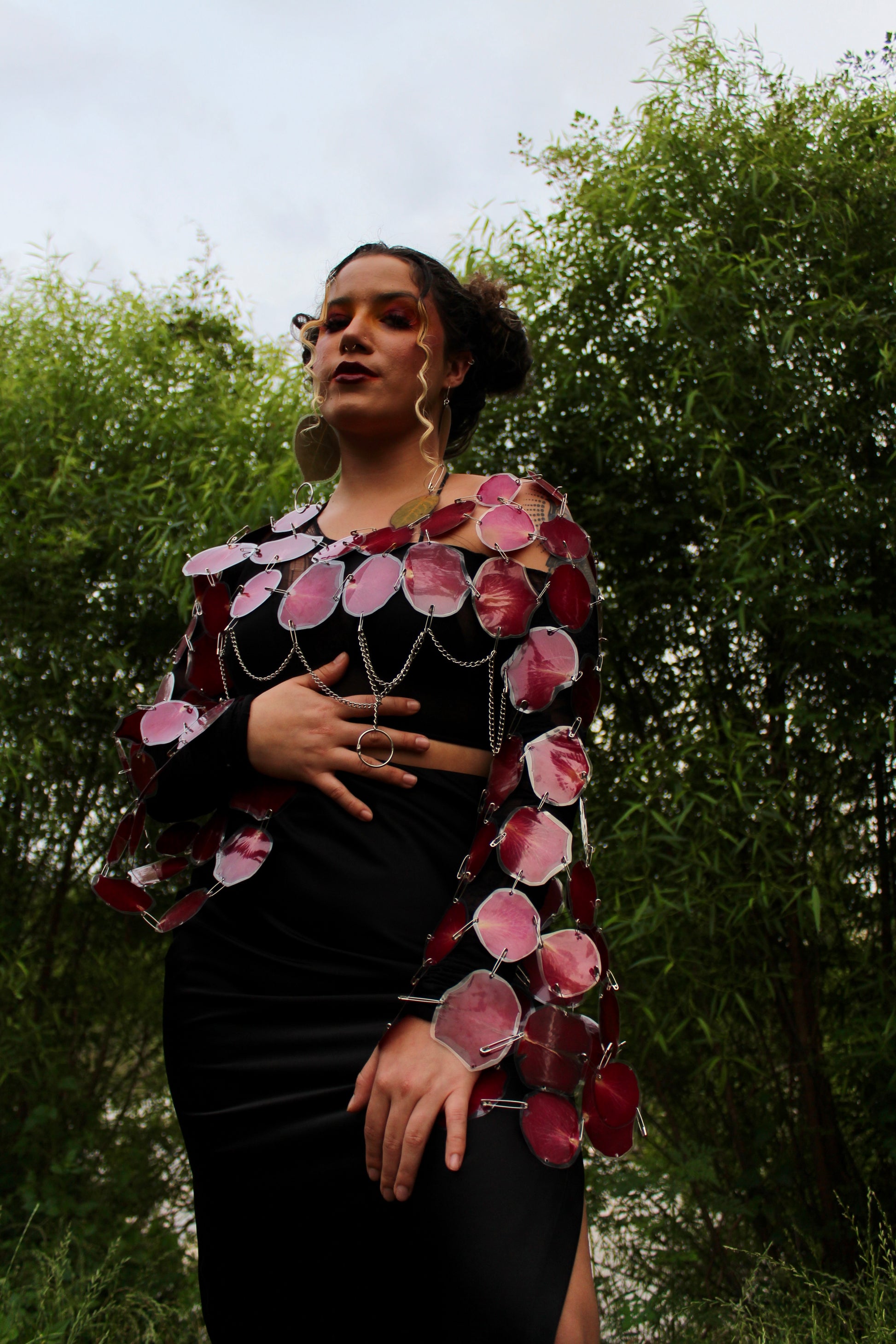 Rose Armor is a wearable sculpture crafted from real rose petals, carefully laminated to preserve their color, translucency, and movement without added weight. Hundreds of petals are individually shaped and assembled by hand, connected with safety pins and draped with stainless steel chains to create a fluid piece that moves with the body.