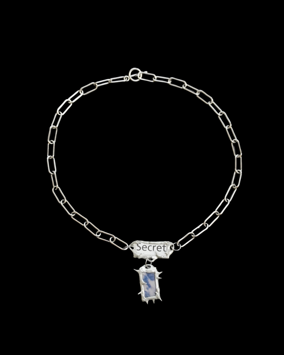 Mantra necklace crafted with repurposed paper, lead free solder, and a stainless steel chain. The word and accompanying image balance the senses of closed and opened. An intimate affirmation to carry with you as a private reminder through time and space.