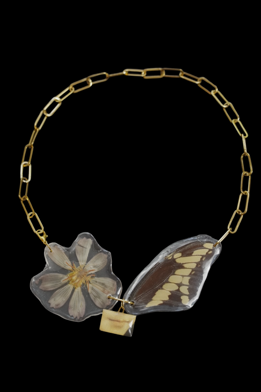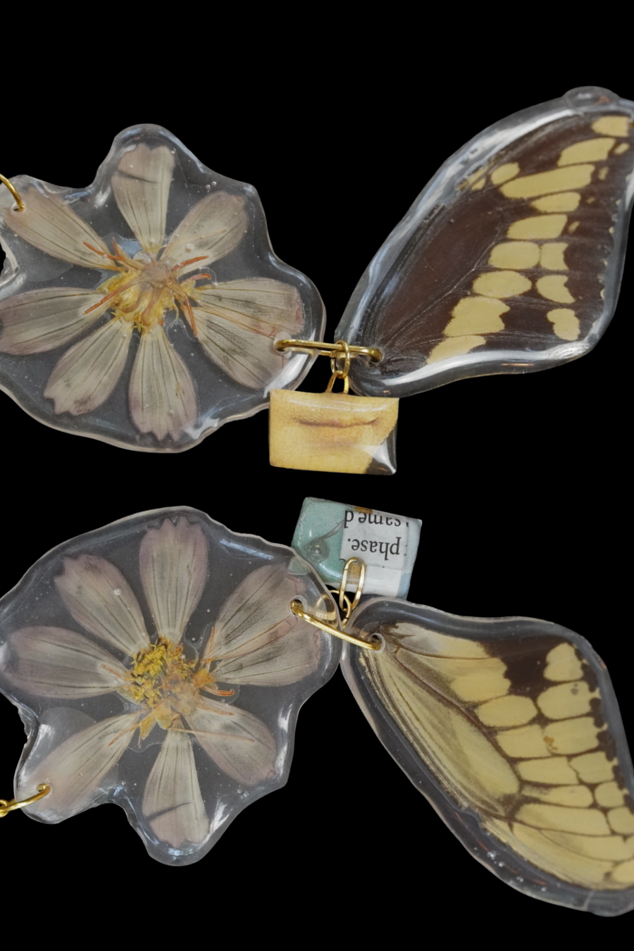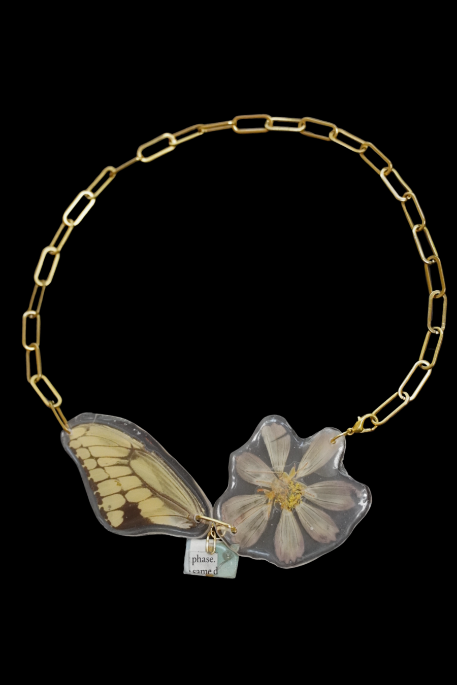 A delicate, intimate necklace combining a true pink cosmos flower, a fragment of black swallowtail wing, and a tiny paper collage, each element sealed in crystal clear resin and strung on a hypoallergenic stainless steel chain. A whisper of femininity, metamorphosis, and quiet collage poetry, wear it close to the heart.