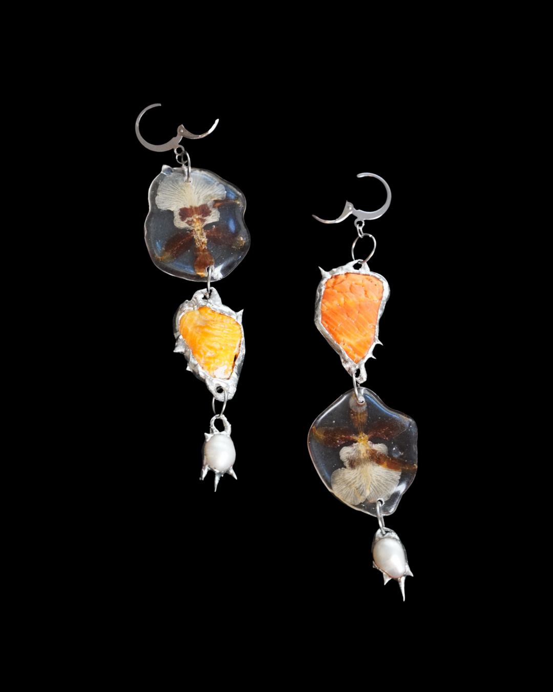 Original earrings featuring tiny dancer orchids, shells, pearls, and lead free solder on hypoallergenic collapsible hooks. A celebration of delicate movement and oceanic grace, blending floral elegance with sea born treasures.