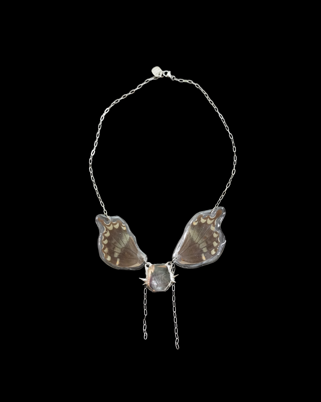 One of a kind necklace handmade with repurposed Fluorite crystal; a powerful stone known for calming and focus inducing properties. Paired with genuine Black Swallowtail Butterfly wings, ethically collected and preserved in resin.